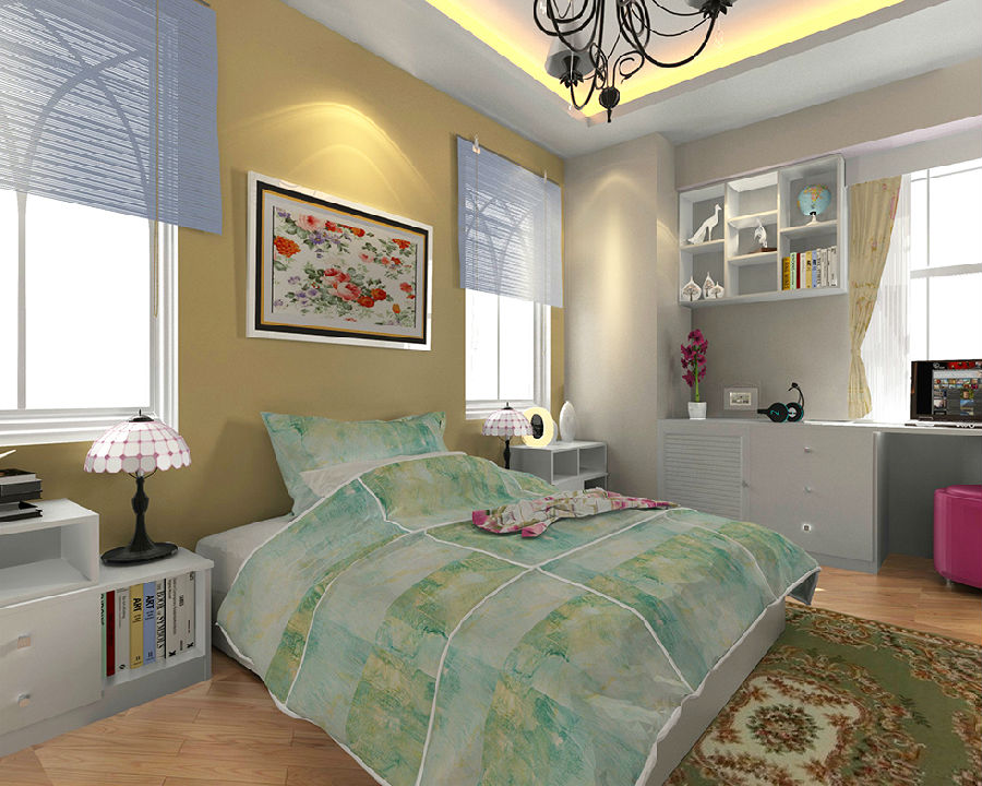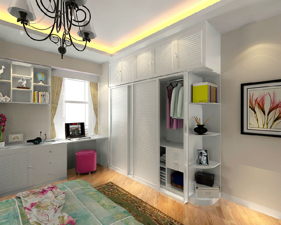 百葉造型直接映入眼簾,與純白色的衣柜相呼應,二者的美好結合,營(yíng)造出一種青春靚麗的時(shí)尚氛圍。燈光下,屋內的陳設熠熠生輝,尤其是空間中大面積使用的繁花圖,給人一種清新脫俗的雅致感。