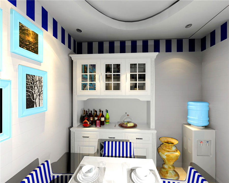 就整體布局來(lái)看,視覺(jué)上十分寬闊,顯得比較有格局。色彩搭配的話(huà),純白色與深藍色的撞擊,不會(huì )顯得很突兀,反而給人一種眼前一亮的感覺(jué)。朱紅色與白色相間的吊燈造型,讓整體氛圍更加貼近自然。